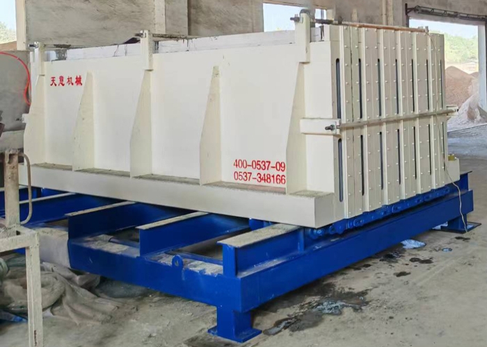 工作原理:模具的开合由下方的液压机构完成,和墙板机类似。合模后的锁紧由上方和两端的拉杆装置实现。下方的强制同步装置保证了大板在开合时的两侧同步。大板下方的轮组保证了大板在开合时不倾斜、不倒伏。